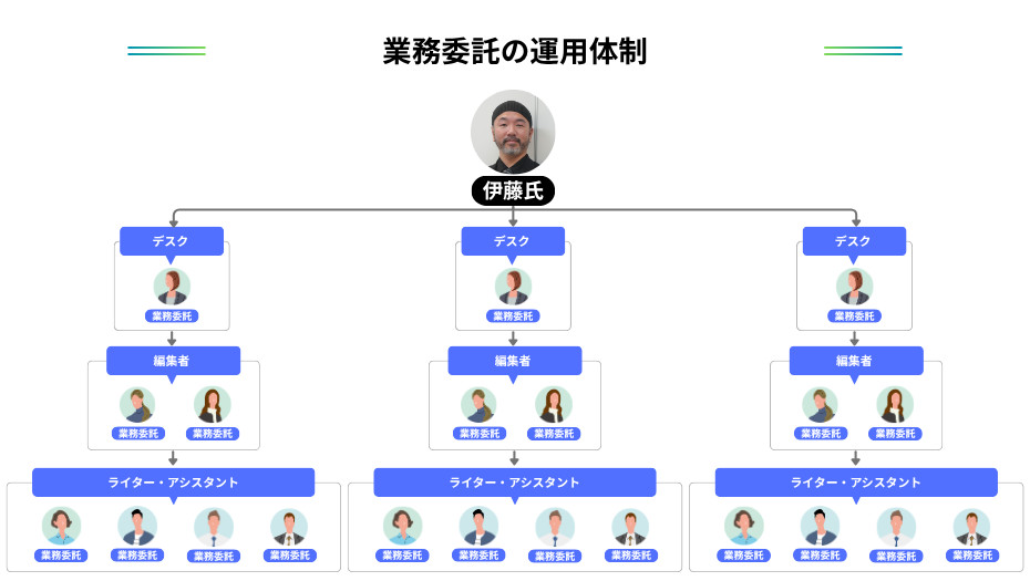 実際の制作体制・ラインは、伊藤氏が制作計画全体と目標・コスト管理を担い、デスク役(編集リーダー)のパートナーが進行と納品確認を担当。執筆・編集・公開といった作業を、ライターや編集者、アシスタントスタッフが受け持つようにしました。また、規模が拡大するにつれ、デスクを複数名立て、それぞれの下に編集者・ライター・公開担当・アシスタントを配置。どこかで詰まっても全体が止まりにくい体制を整えていきました。